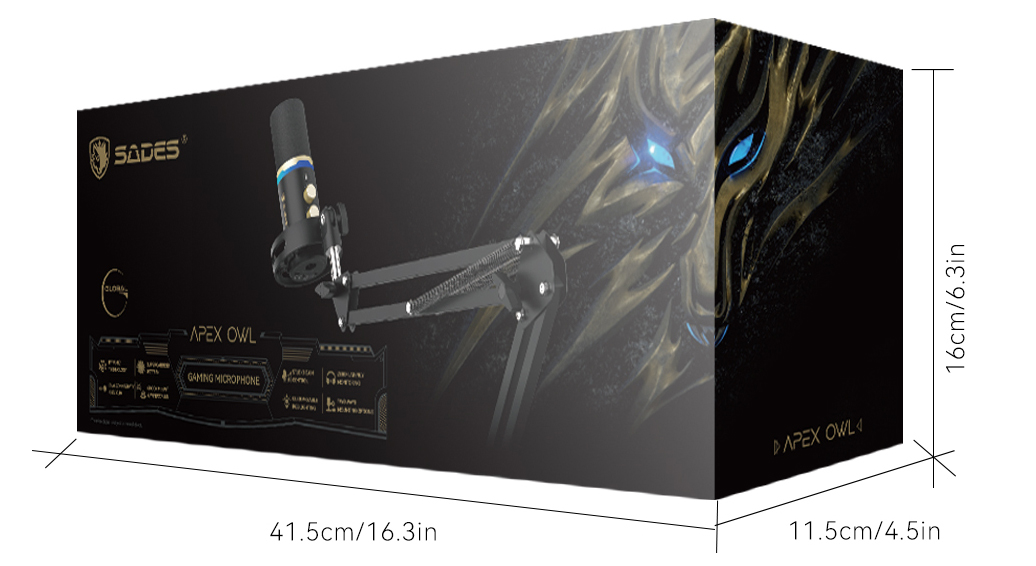 SADES Apex Owl is a dynamic microphone engineered for elite gamers and streamers, delivering broadcast-quality voice clarity with its supercardioid pickup and background noise rejection, plus dual USB/ XLR connectivity, customizable RGB lighting, and intuitive pro controls.